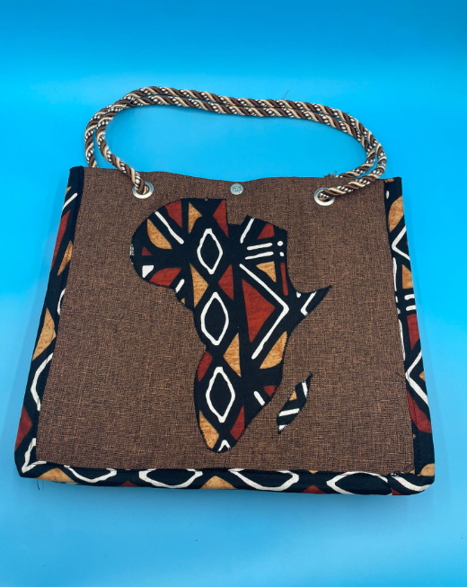 Celebrate heritage and style with the Roots Tote, a beautifully crafted handbag featuring a bold Africa map appliqué in vibrant traditional print. Designed with a sturdy fabric body, rope handles, and eye-catching patterns, this bag is both functional and fashion-forward. Perfect for everyday use, shopping, or as a unique cultural statement piece.