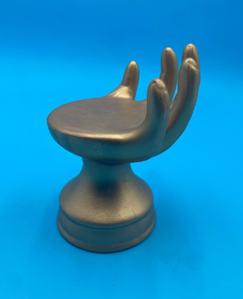 This unique hand-shaped display stand features a smooth gold finish and artistic design—perfect for showcasing jewelry, small trinkets, or simply as a bold decorative piece. A modern blend of function and sculpture that adds elegance to any space.